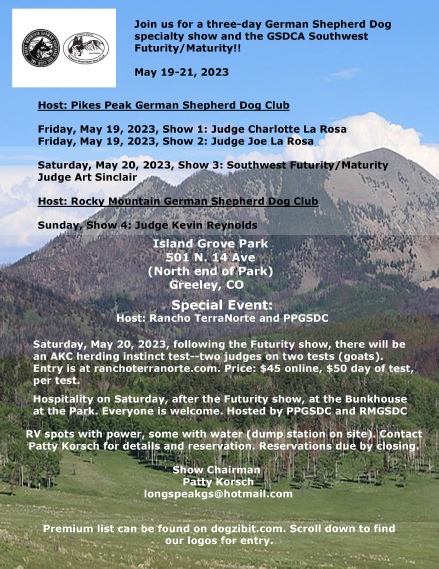 GSDCA Southwest Futurity/Maturity Weekend in Colorado, Pikes Peak German Shepherd Dog Club and Rocky Mountain German Shepherd Dog Club- Island Grove Regional Park, Greeley, CO.
